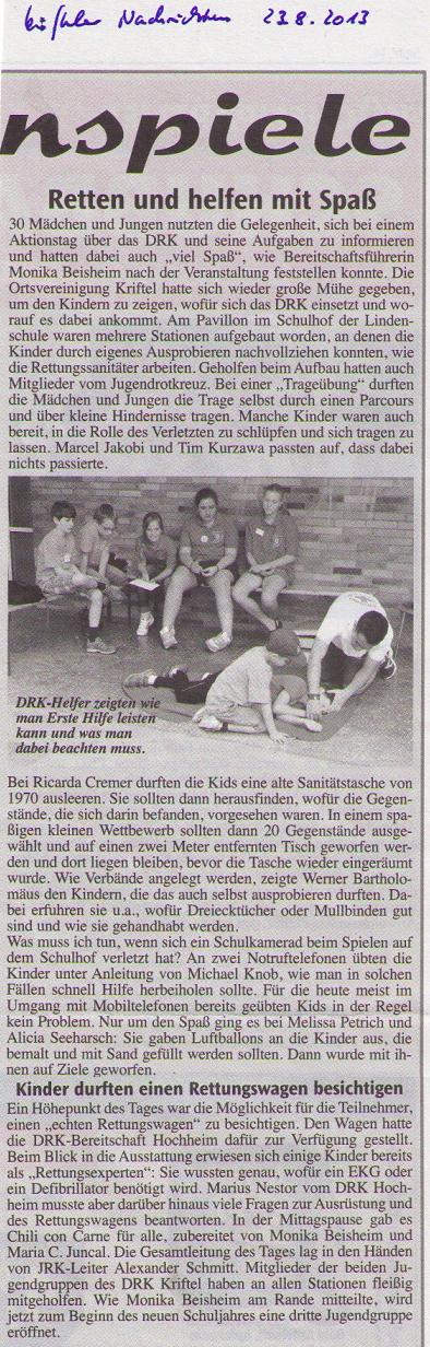 Am Samstag den 17.08.2013 nahm das DRK Kriftel an den Ferienspielen der Gemeinde Kriftel mit der Veranstaltung "Ein Tag beim DRK" teil.