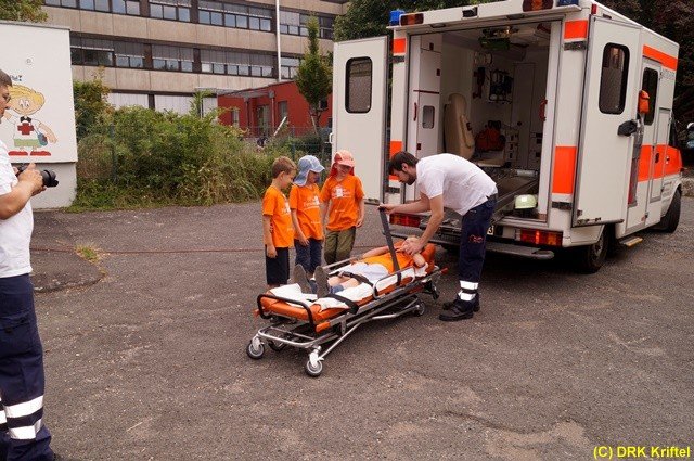 Das Highlight bei den Stationen war die Besichtigung eines echten Rettungswagens. Das Fahrzeug hatte die DRK-Bereitschaft Hochheim zur Verfügung gestellt. Rettungssanitäter Marius Nestor und Rettungsassistent Benno Hofmann mussten viele Fragen zur Ausrüstung und Handhabung der Geräte im Rettungswagen beantworten. Das EKG und der Defibrillator wurde genauso wie auch der Inhalt des Notfallkoffers von den Kindern genauestens inspiziert.