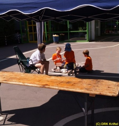 Am Pavillon im Schulhof der Lindenschule waren 6 Stationen aufgebaut worden, an denen die Kinder duch eigenes Ausprobieren innerhalb von 30 Minuten nachvollziehen konnten, wie die Sanitäter arbeiten.