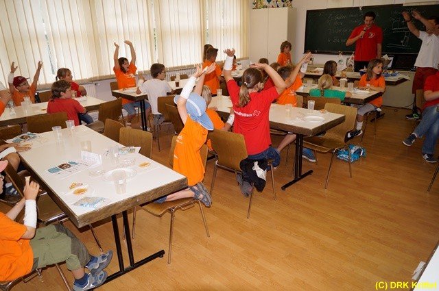 Die Zeit verging viel zu schnell. Um 14:30 Uhr riefen Alexander Schmitt und Norbert Beisheim alle Betreuer, Jugendrotkreuz-Mitglieder und Ferienspielkindern in den Unterrichtsraum. Hier erhielt jedes Kind von den Organisatoren ein Pflasterdiplom und ein Erste-Hilfe-Set ausgehändigt. Bevor die Eltern ihre Sprösslinge wieder abholten, wurde sich noch bei Saft und Kuchen gestärkt.