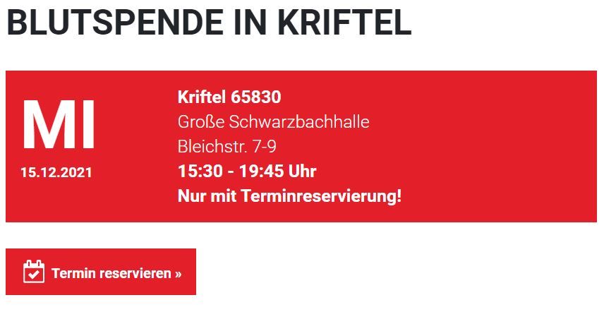 Der DRK Blutspendedienst und die DRK Orstvereinigung Kriftel laden ein zur Blutspende.