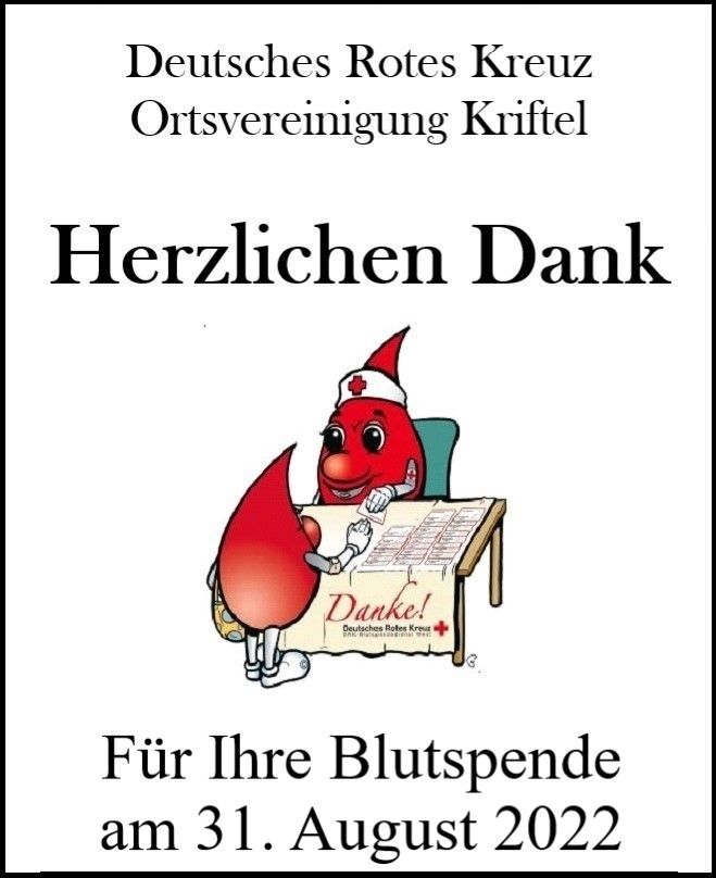 Danke an 147 erschienen Spende willige bei der heutigen Blutspende in der Schwarzbachhalle Kriftel. Aus medizinischen Gründen wurden 10 Spender von der Blutspende ausgeschlossen, sodass 137 Konserven für den Blutspendedienst gewonnen werden konnten. Der besondere Dank geht an die 19 Spender und Spenderinnen die zum ersten Mal den Mut hatten ihr Blut zu geben.
