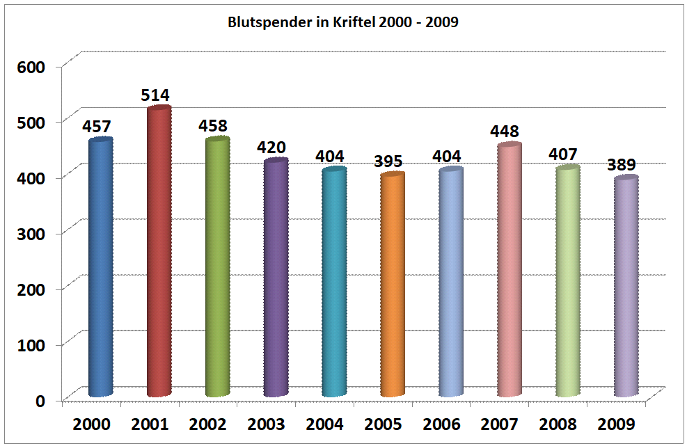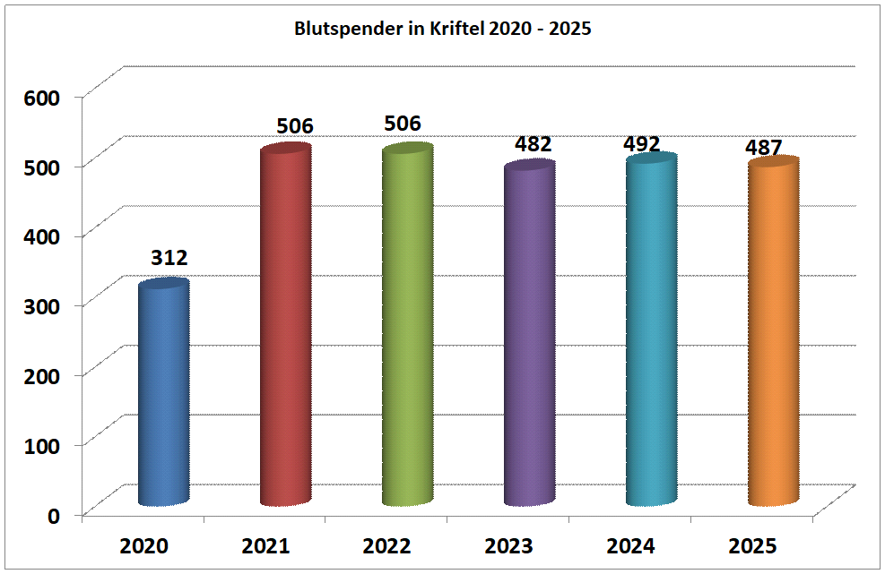 Bisherige Bilanz: Bei insgesamt 150 öffentlichen Blutspende-Aktionen konnten in Kriftel 14712 Blutkonserven gewonnen werden. Wenn man allerdings bedenkt, dass derzeit zur Sicherstellung des Bedarfs an hessischen Krankenhäusern wöchentlich ca. 5000 Blutkonserven benötigt werden, dann würde das Krifteler Spenderblut allein gerade einmal die Nachfrage von zwei Wochen abdecken.
