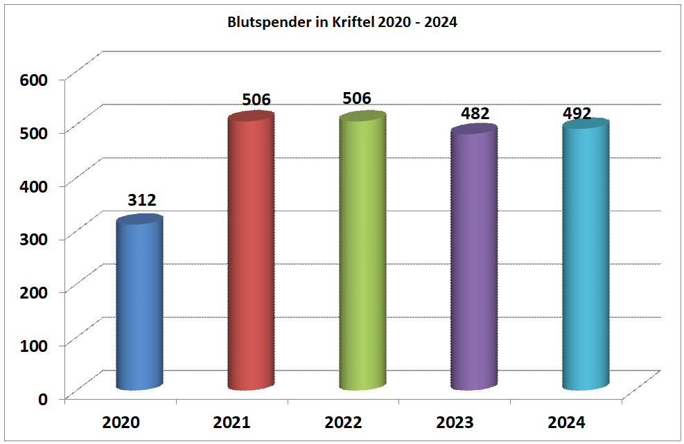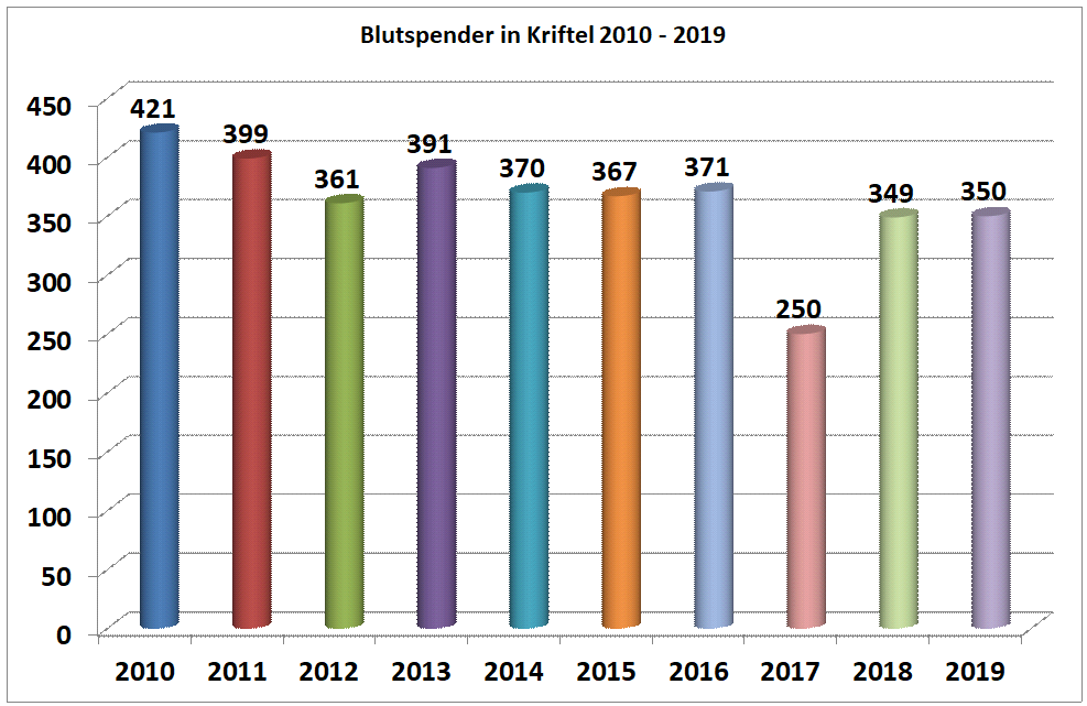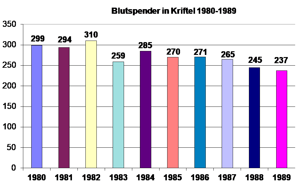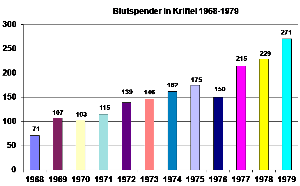 Auf den ersten öffentlichen Aufruf der Gemeinde hin kamen am 13.März 1968 nicht weniger als 71 freiwillige Spenderinnen und Spender ins Bürgerhaus. Dieses gute Ergebnis veranlasste das DRK Kriftel, in den Folgejahren jeweils zwei Termine zu organisieren. Ab 1979 waren es drei, seit 1992 sind es vier Termine.